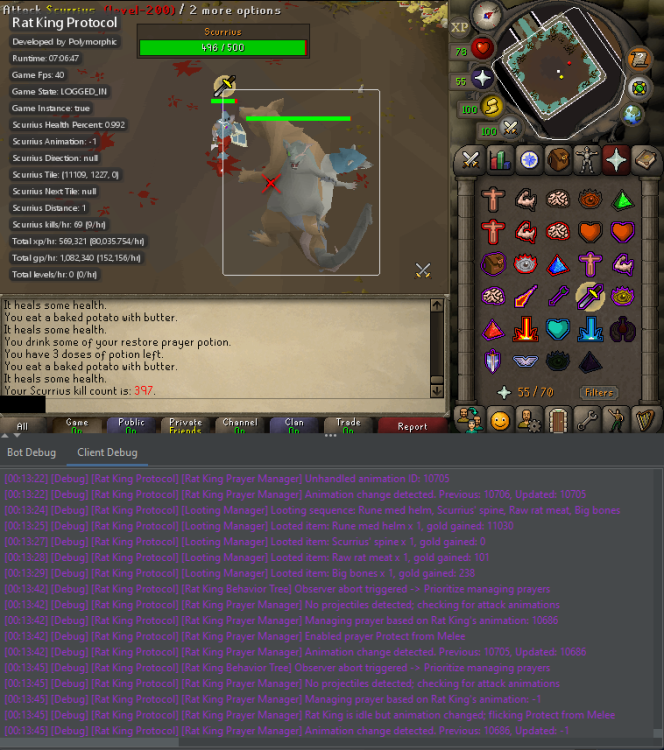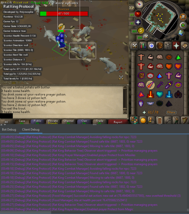 Hello users, Some new exciting updates and fixes. Here's a breakdown of what's new: Fixes: Restock Zero Items Malfunction: I've resolved the issue causing restock zero items malfunction. You should now be able to restock items without any hiccups. Combat Potions Optimization: Super and regular combat potions will no longer consume doses as frequently, providing a smoother combat experience. Falling Stones Interaction: I've fixed the problem where players would return to the tile where a stone fell, even after moving away. Additions: Client Args Support: I've introduced client args support for greater flexibility and customization options. Customizable Eating Threshold: You can now configure your eating preferences based on health percentage, allowing for more personalized gameplay. Adjustable Mouse Speed: With the new configuration option, you can set your preferred mouse speed for precise control. Progressive Combat: Say hello to progressive combat! Now, your attack styles will switch dynamically based on your combat stat levels, optimizing your fighting strategy. Target Prioritization: I've implemented a feature to almost always prioritize killing giant rats, especially for lower level players. Additionally, the system will attempt to get at least one hit in on the boss while dealing with giant rats.
