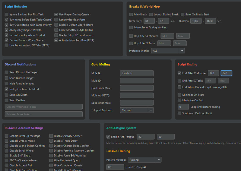 NateDog 0 Posted October 31, 2022 Share Posted October 31, 2022 (edited) Can you get the script to turn off accept aid? I think my test account going to get banned I just looked at my screen to see a tele other screen up and it locked the bot up. ----- Nice script though it seems very stable, all the quests I've tried have been flawless. Not sure how you would solve this problem but I find that between restarts it cancels offers and keeps pushing them up in price if you hit G.E. limits, if you could add a max % diff from current grand exchange prices that would be awesome. If you run out of supplies and have additional tasks queued up will it switch to the next task? Edited October 31, 2022 by NateDog Quote Link to comment Share on other sites More sharing options...